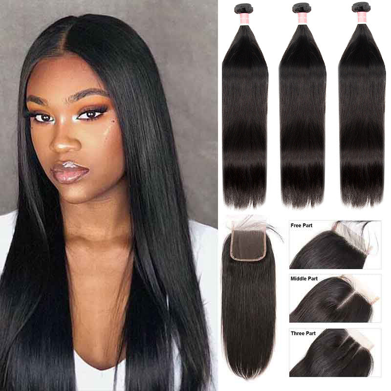 B Top Virgin Straight Hair 3 Bundles with 4x4 HD Lace Closure